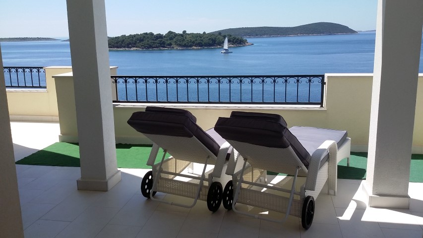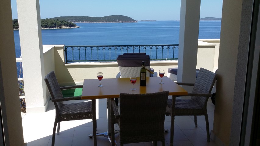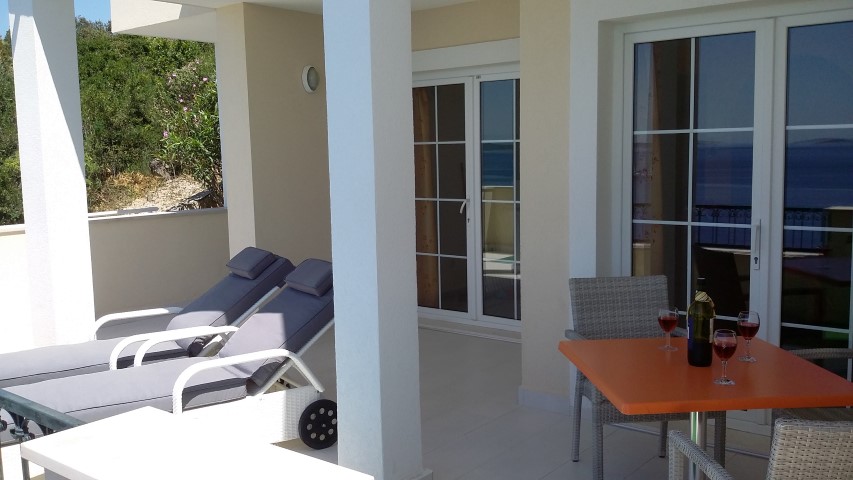 Wohnraum mit Küchenzeile, Geschirr, Kaffeemaschine, Kühlschrank, TV-SAT, 2 offene Schlafräume, WC mit Dusche, Terrasse mit Meerblick. (Belegung mit 3 Personen)