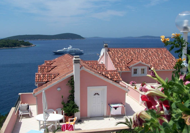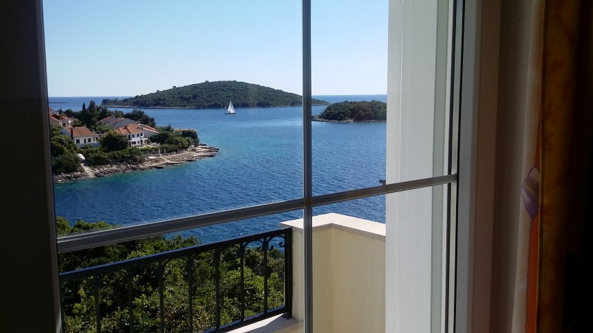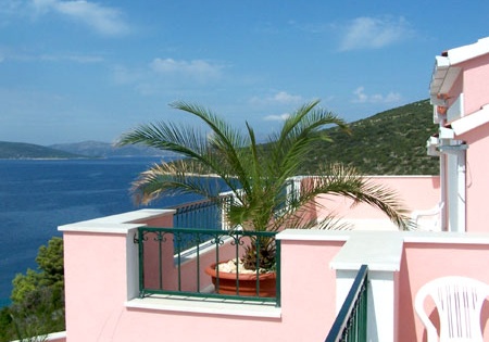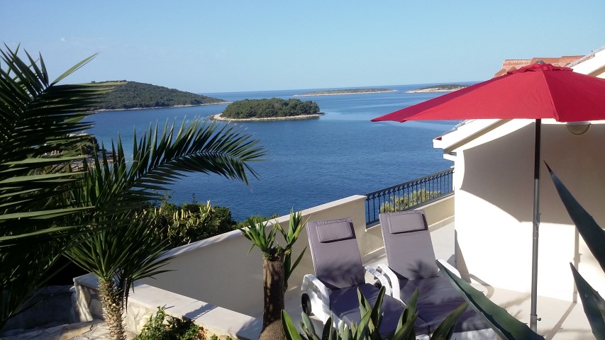 großer Wohnraum mit Küche, Geschirr, Kaffeemaschine, Kühlschrank, TV-SAT, Schlafzimmer, WC mit Dusche und Badewanne, Fußbodenheizung, Terrasse mit Meerblick. (Belegung mit 2 Personen und eine Aufbettung ist möglich)